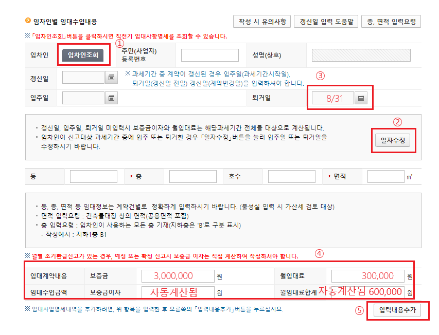 ①임차인 조회 버튼을 눌러 작년 임차인을 불러 온 후 ②일자 수정을 클릭 ③퇴거일을 기재 해 줍니다. 퇴거일을 설정해 주면 해당 월세를 자동 계산해서 임대계약내용에 반영 해 주어요. ④금액이 맞는지 확인하고 ⑤입력내용 추가를 눌러 직전 세입자 내용을 반영 해 줍니다.