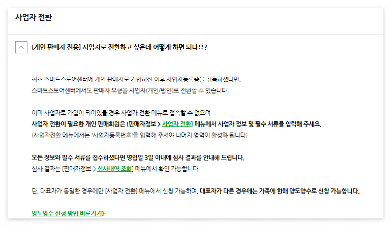 최초 스마트 스토어를 개인으로 가입하였는데 사업자 등록도 완료되었으니 사업자 전환을 신청하려고 합니다. 사업자 전환 절차에 관련하여 스마트 스토어 고객센터에 관련된 내용이 있어 찾아 보았습니다.