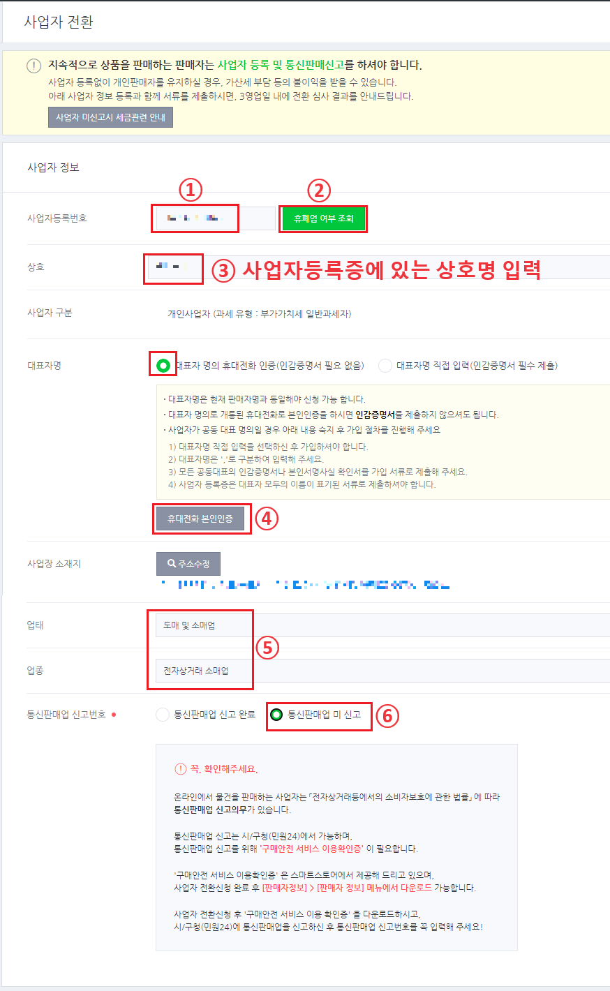 ⑥ 통신판매업 신고 완료 상태라면 신고번호를 입력해 주시면 됩니다. 저는 아직 통신판매업 신고가 되어 있지 않고 사업자 전환 후 스마트스토어에서 제공하는 구매안전 서비스 이용확인증을 다운받아 통신판매업 신고 할 예정입니다.