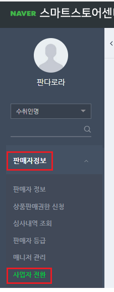 스마트 스토어 왼쪽 사이드 메뉴 하단으로 내려가 보면 판매자 정보가 있습니다. 클릭하여 하위 메뉴 중 사업자 전환으로 들어가 신청하면 됩니다.