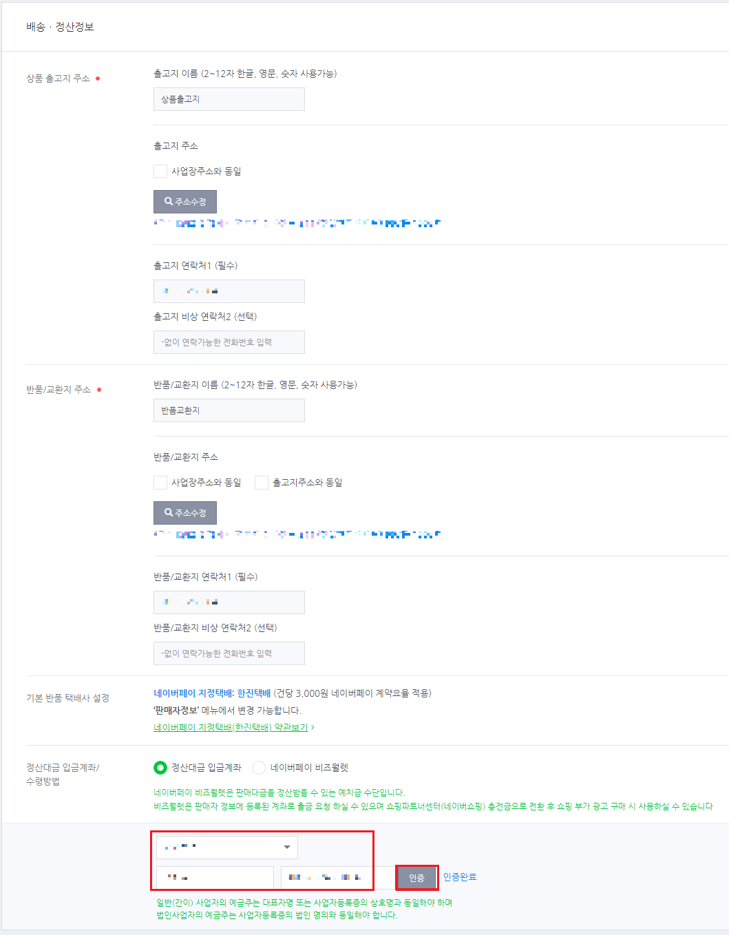 정산대금 입금계좌 정보를 입력 해 줍니다. 입력 후 인증 버튼을 클릭하여 인증완료 해 주셔야 합니다.