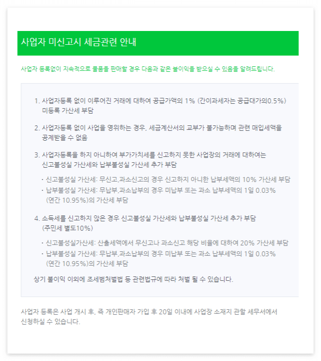 사업자 미신고시 세금관련 이슈가 생길 수 있기 때문에 스마트스토어로 지속적으로 물품을 판매하는 경우라면 사업자등록을 진행하는 것이 필요합니다.