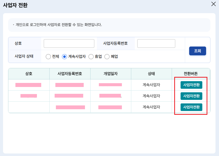 여러개의 사업자를 가지고 있는 경우 개인 공인인증서로 로그인하여도 사업자를 선택할 수 있는 서비스 내용인데요. 사업자가 1개인 경우에도 사업자 전환을 해야 사업자로 인식하는 것 같아요.