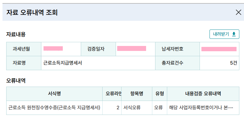 홈택스 제출 오류를 살펴보니 사업자등록번호가 안맞다는 내용인데요. 사업자 등록번호를 따로 입력한 것도 아닌데 이런 오류가 뜨니 당황스럽더라고요.
