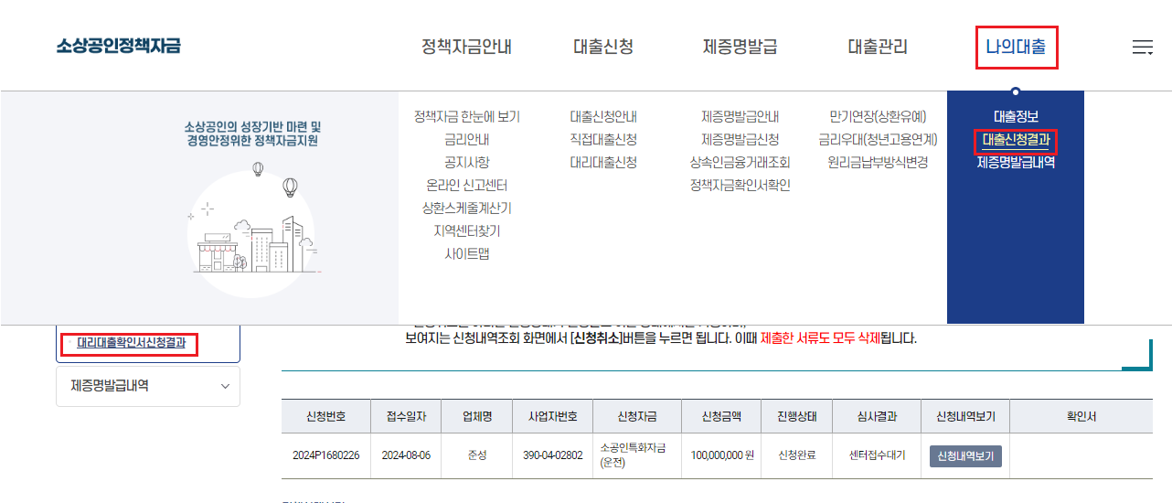 소상공인 정책자금 지원대상 확인서를 발급받기 위한 대리대출 신청이 완료되었습니다. 신청이 완료되면 진행상태는 신청완료로 되고 심사 결과는 진행단계에 따라 변경됩니다.