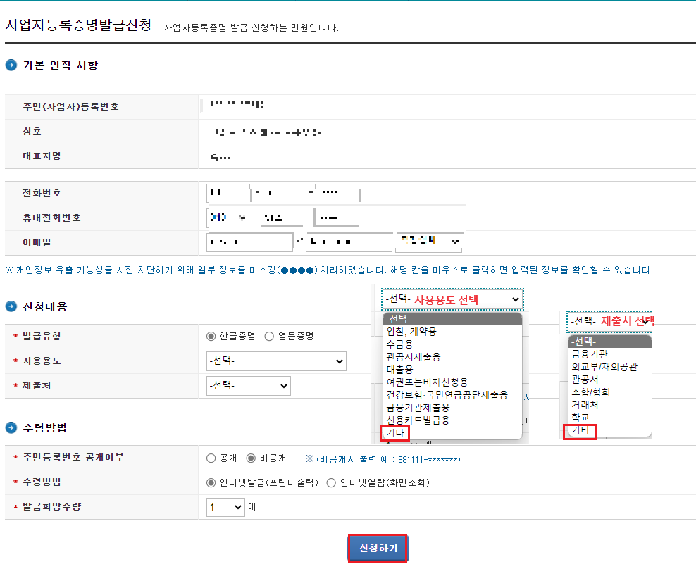 사업자등록 증명 발급 신청 메뉴에서 인적사항을 확인 한 후 신청내용을 기재 해 줍니다. 신청내용은 필수이므로 반드시 선택 해 줘야 합니다.