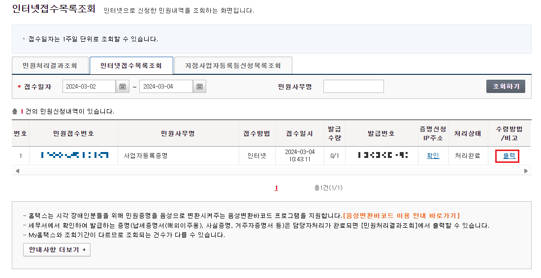 위에서 신청하기 버튼을 클릭하면 사업자등록증명 신청이 완료되며 인터넷 접수 목록 조회 화면으로 자동 이동 됩니다. 방금 신청한 사업자등록 증명 신청내역이 조회되고 오른쪽 끝 수령방법의 출력을 클릭하여 사업자등록증명을 출력하실 수 있습니다.
