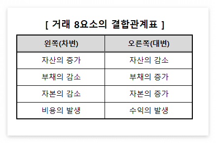 기업에서 일어나는 거래는 결국 자산의 증가와 감소, 부채의 증가와 감소, 자본의 증가와 감소 및 수익의 발생과 비용의 발생이라는 8개 요소로 구성되어 있는데 이를 거래의 8요소라고 합니다. 거래의 8요소가 서로 결합되어 여러 가지 조합을 이루는 관계를 나타낸 표를 거래 8요소의 결합관계표 라고 합니다.